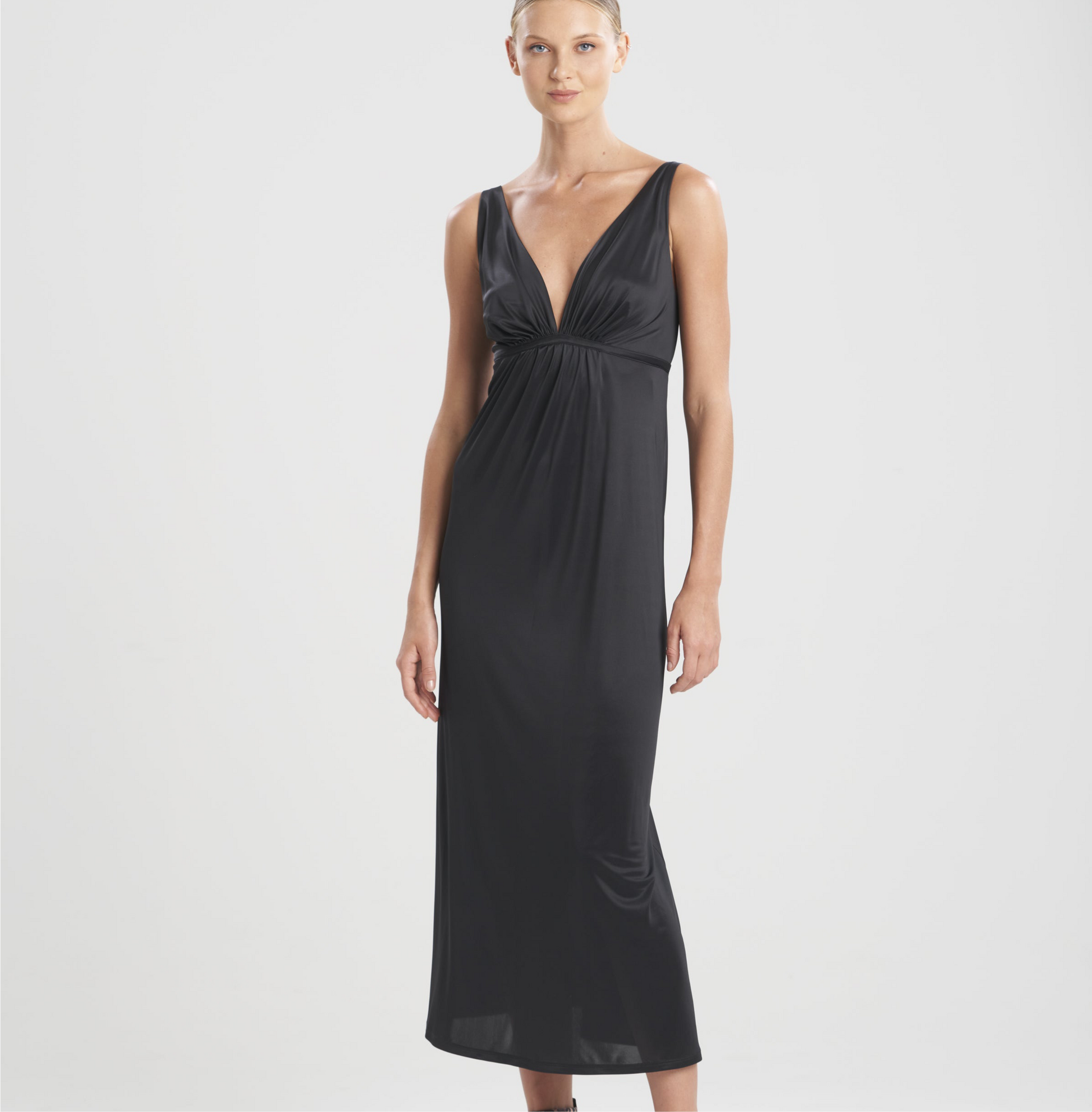 Our slinky knit fabric is smooth and cool to the touch with a drape that won't cling.