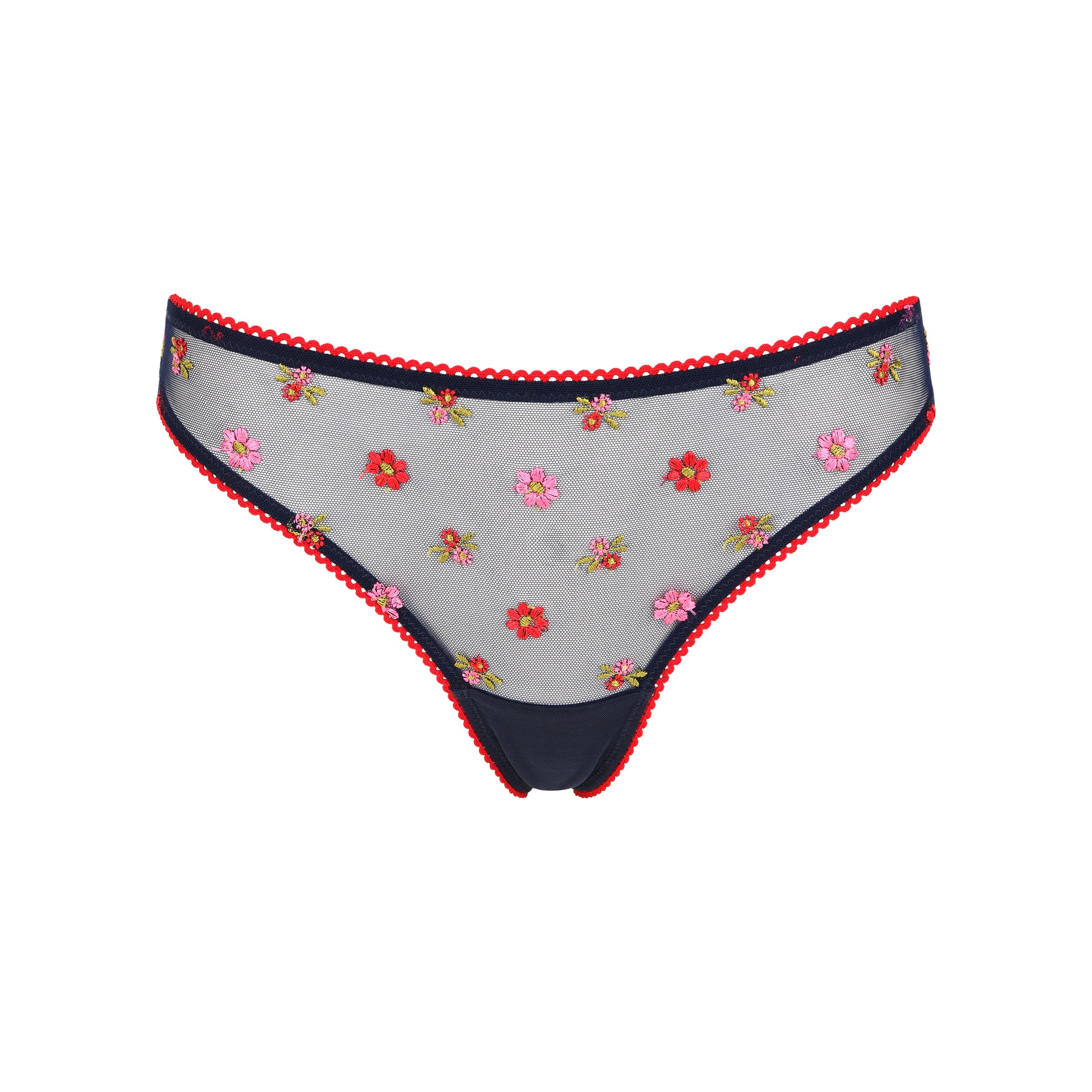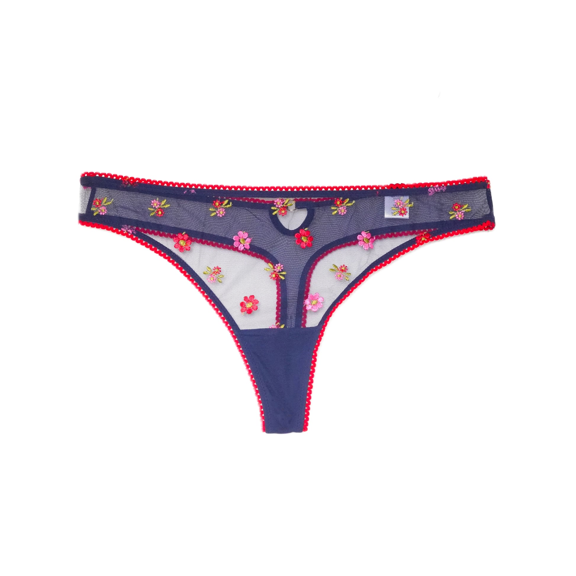 Crafted from sheer navy mesh, this elegant tanga features intricately embroidered floral motifs in soft pink and red tones, delicately placed to highlight the body’s natural lines. The contrast of navy and red adds a bold, feminine edge, while scalloped lace edges frame the silhouette with subtle vintage charm.
