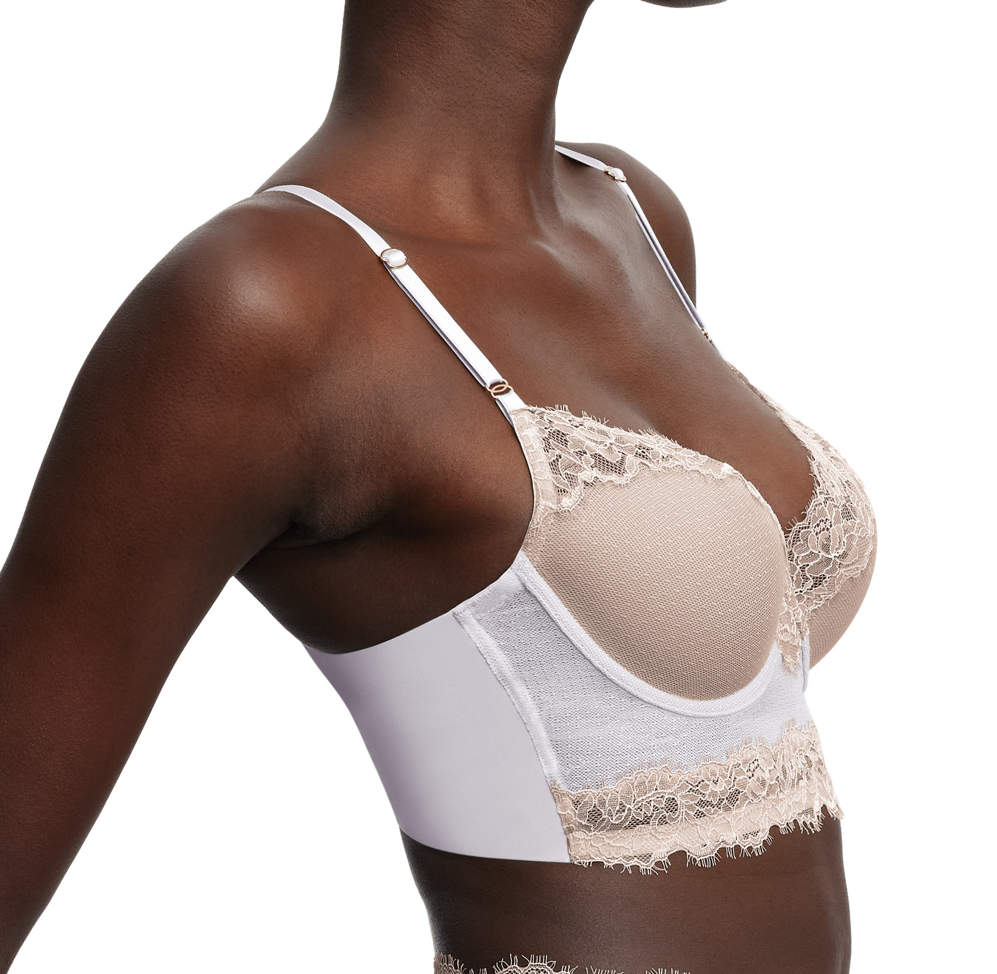 Lingerie made to be seen. Longline T-shirt bra, sheer dotted lace is paired with our beloved Entice lace trim for a style that easily transitions from your everyday T-shirt bra to your girl's night out top. Wear it with the matching High Waisted Brief to complete the look.