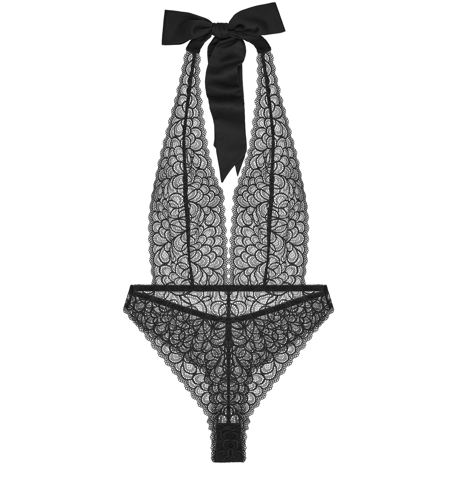 Karina is crafted with lace and exquisite strapping details. It features scalloped lace, reminiscent of sea shells, with elegant picot trim. The bold cut-outs and strapping create a dramatic and provocative effect on the body.