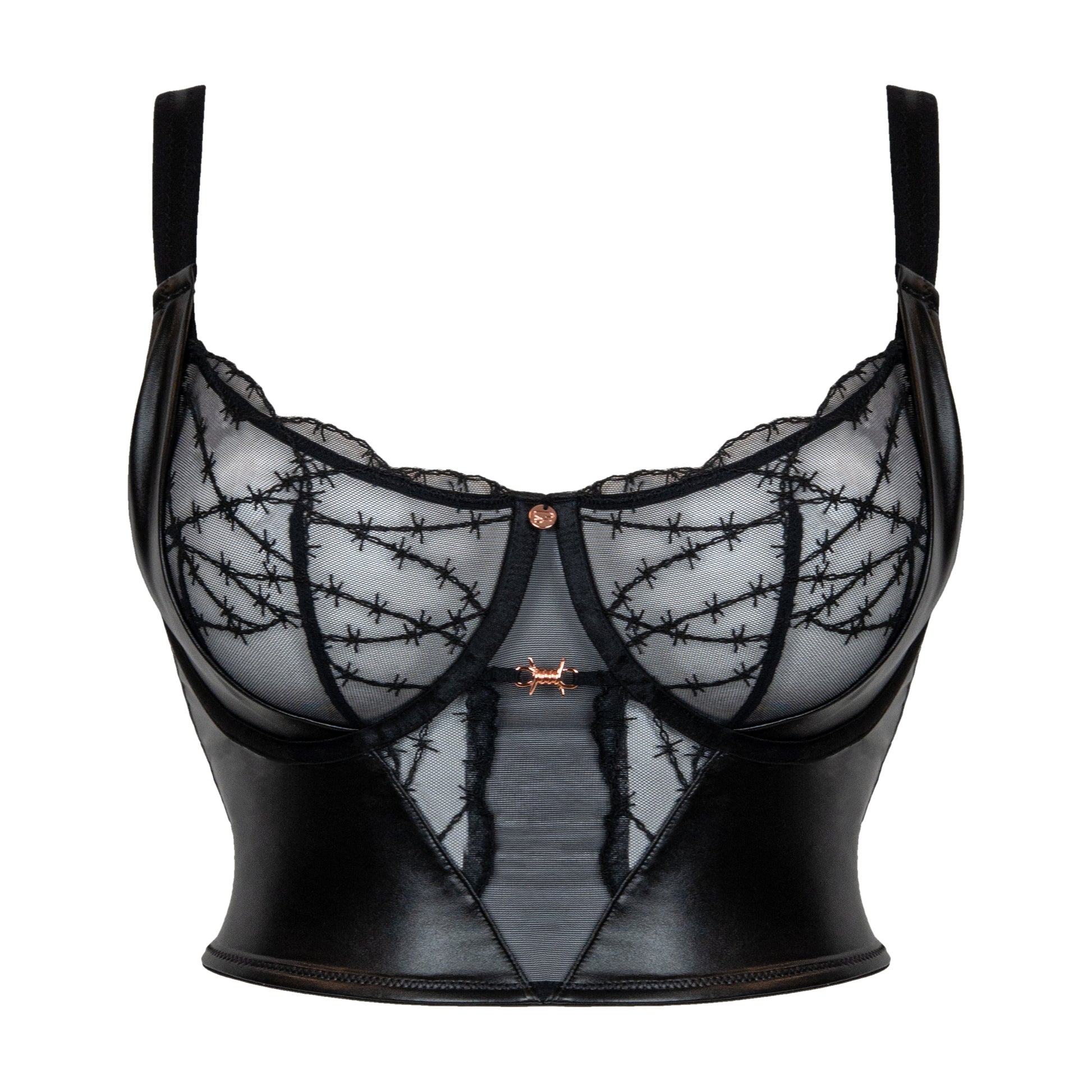 Introducing your longline balcony bra, combining bespoke barbed wire embroidery with stretch pleather and unique barbed rose gold charm.